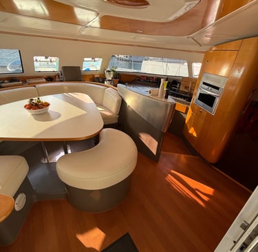 With 4 spacious double cabins — each with air conditioning and a private bathroom — and 3 additional crew bunks, she offers plenty of space for rest and retreat. The open salon seats 10 and flows into a fully equipped U-shaped galley with induction cooking, combi oven, large fridge, and triple water system: fresh, seawater, and filtered drinking water.