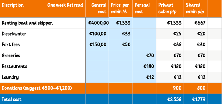 This includes everything: meals, sailing, sessions, and shared daily life.